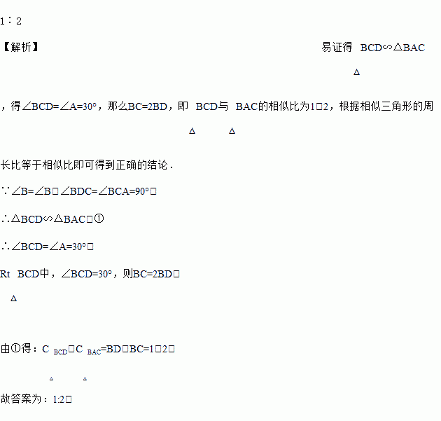 如图,在Rt△ABC中,∠ACB=90°,∠A=30°,CD⊥AB于点D,则△BCD与△ABC的周长之比为________.