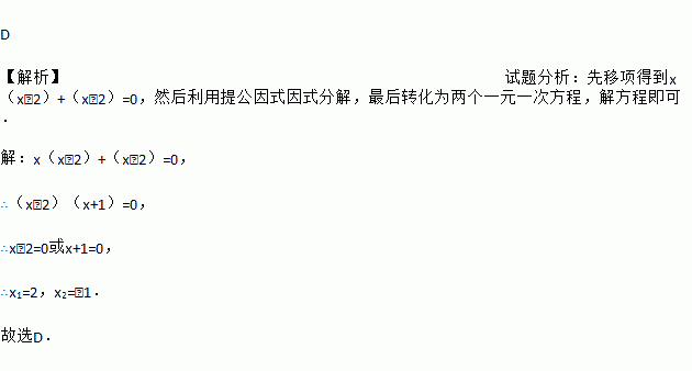 D 【解析】试题分析:先移项得到x(x﹣2)+(x﹣2)=0,然后利用提公因式因式分解,最后转化为两个一元一次方程,解方程即可. 【解析】 x(x﹣2)+(x﹣2)=0, ∴(x﹣2)(x+1)=0, ∴x﹣2=0或x+1=0, ∴x1=2,x2=﹣1. 故选D.