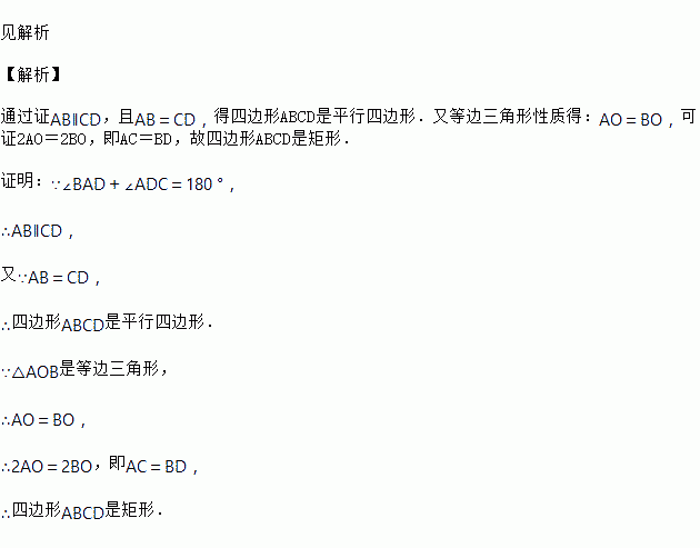 如图,四边形ABCD中,AB=CD,∠BAD+∠ADC=180°,AC与BD相交于点O,△AOB是等边三角形,求证:四边形ABCD是矩形.