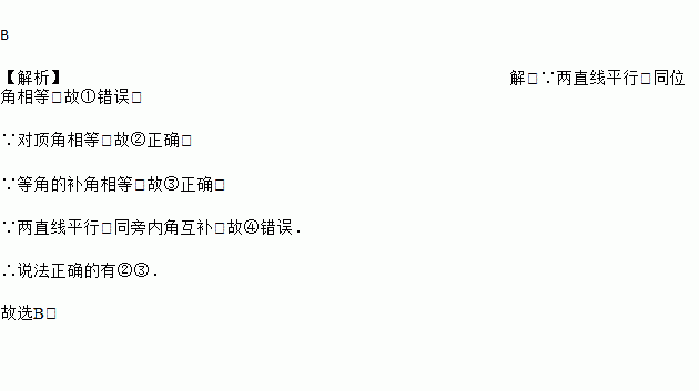 ①同位角相等;②对顶角相等;③等角的补角相等;④两直线平行,同旁内角相等