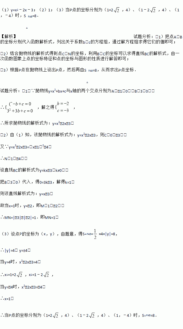 (1)y=x2﹣2x﹣3;(2)1;(3)当P点的坐标分别为(1+2,4)、(1﹣2,4)、(1,﹣4)时,S△PAB=8. 【解析】试题分析:(1)把点A、B的坐标分别代入函数解析式,列出关于系数b、c的方程组,通过解方程组求得它们的值即可; (2)结合抛物线的解析式得到点C、N的坐标,利用B、C的坐标可以求得直线BC的解析式,由一次函数图象上点的坐标特征和点的坐标与图形的性质进行解...
