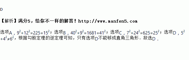A. 9、12、15 B. 41、40、9 C. 25、7、24 D. 6、5、4
