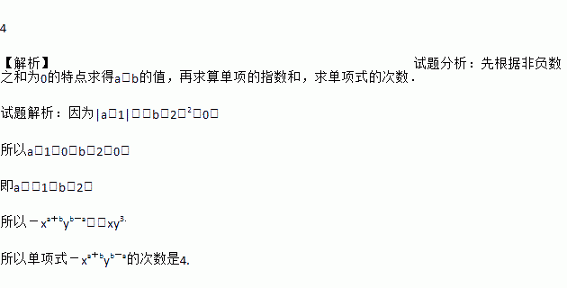 4 【解析】试题分析:先根据非负数之和为0的特点求得a,b的值,再求算单项的指数和,求单项式的次数. 试题解析:因为|a+1|+(b-2)2=0, 所以a+1=0,b-2=0, 即a=-1,b=2. 所以-xa+byb-a=-xy3. 所以单项式-xa+byb-a的次数是4.