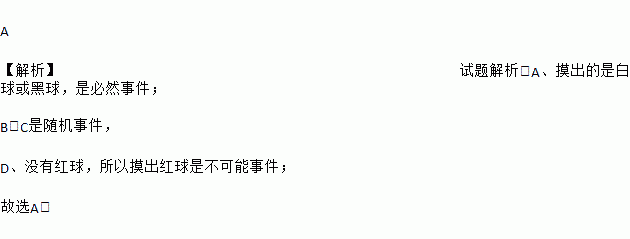A 【解析】试题解析:A、摸出的是白球或黑球,是必然事件; B、C是随机事件, D、没有红球,所以摸出红球是不可能事件; 故选A.