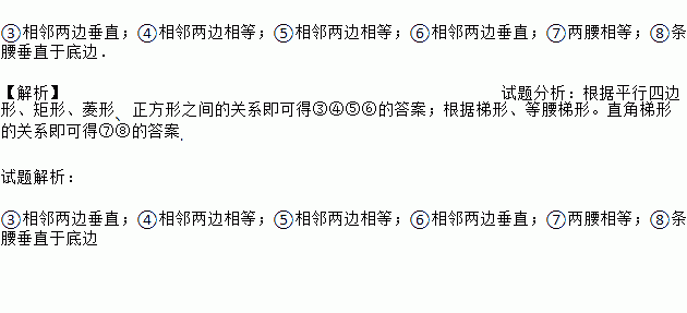 我们学习了四边形和一些特殊的四边形,如图表示了在某种条件下它们之间的关系.如果①,②两个条件分别是:①两组对边分别平行;②有且只有一组对边平行.那么请你对标上的其他6个数字序号写出相对应的条件.