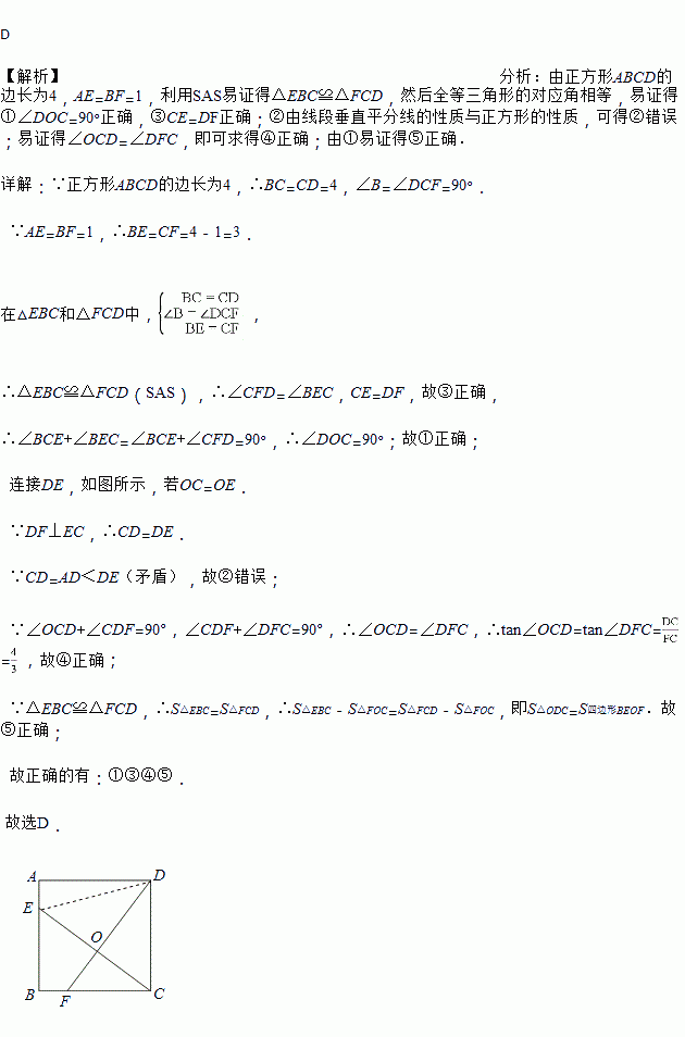如图,正方形ABCD的边长为4,点E、F分别在AB、BC上,且AE=BF=1,CE、DF交于点O,下列结论:①∠DOC=90°,②OC=OE,③CE=DF,④tan∠OCD=