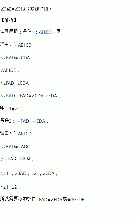 如图,∠1=∠2,需增加条件__________可以使得AB∥CD(只写一种).