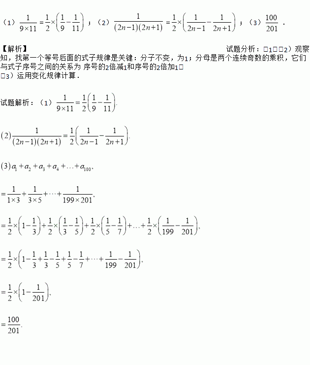 (1)=;(2)=;(3). 【解析】试题分析:(1)(2)观察知,找第一个等号后面的式子规律是关键:分子不变,为1;分母是两个连续奇数的乘积,它们与式子序号之间的关系为 序号的2倍减1和序号的2倍加1. (3)运用变化规律计算. 试题解析:(1)