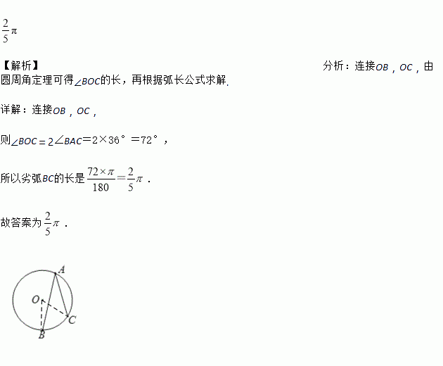 如图,⊙O的半径为1,A、B、C是圆周上的三点,∠BAC=36°,则劣弧BC的长是____________.