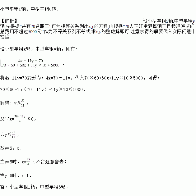 某公司组织退休职工组团前往某景点游览参观,参加人员共70人.旅游景点规定:①门票每人60元,无优惠;②上山游览必须乘坐景点安排的观光车游览,观光车有小型车和中型车两类,分别可供4名和11名乘客乘坐;且小型车每辆收费60元,中型车每人收费10元.若70人正好坐满每辆车且参观游览的总费用不超过5000元,问景点安排的小型车和中型车各多少辆?
