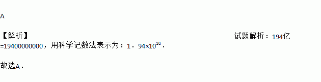 A 【解析】试题解析:194亿=19400000000,用科学记数法表示为:1.94×1010. 故选A.