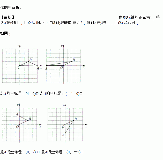 数学活动课上,在探究平面直角坐标系内点的坐标与图形面积活动中,已知点O(0,0),B(2,1),A点在坐标轴上,老师要求画三角形OAB,且三角形OAB的面积为2.请聪明的你在下面所给的四个坐标系中分别画出符合条件的三角形OAB(即在每个坐标系中画出符合条件的一种情况),并在图的下方直接写出A点的坐标.