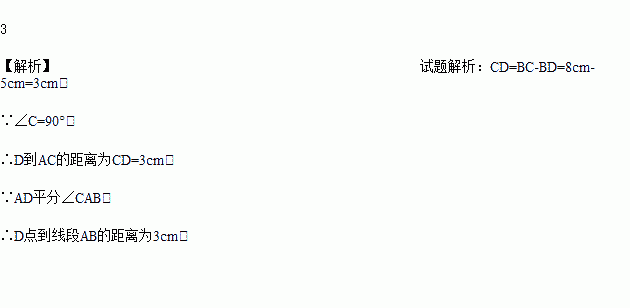 如图,在△ABC中,∠C=90°,AD平分∠CAB,BC=8cm,BD=5cm,那么点D到线段AB的距离是__________cm.