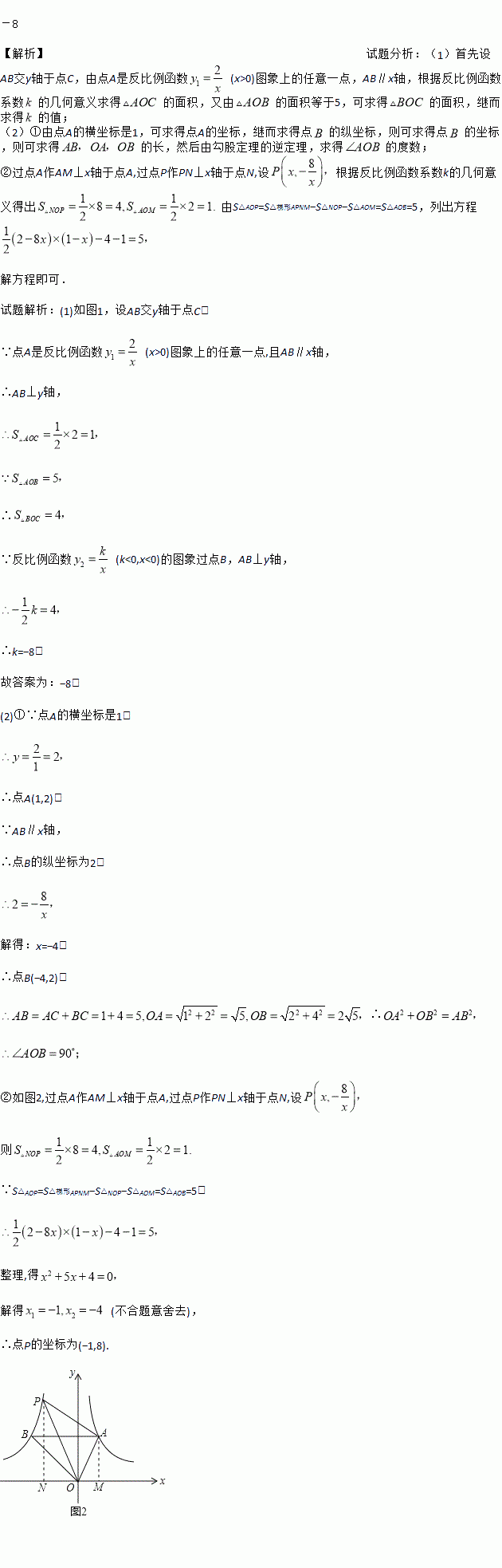 ②在y2的图象上找一点P(异于点B), 使S△AOP=S△AOB,求点P的坐标.