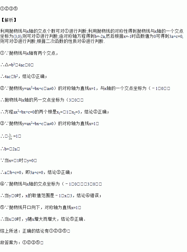 ①4ac<b2;②方程ax2+bx+c=0的两个根是x1=﹣1,x2=3;
