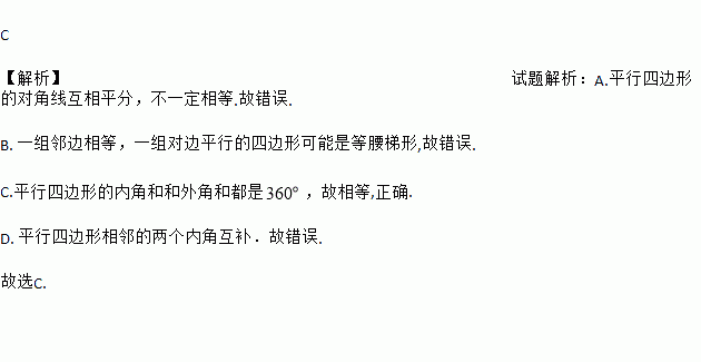 C. 平行四边形的内角和与外角和相等;