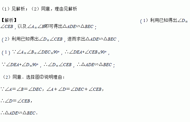 (2)一名同学在尝试了上题后还发现:如图②、图③,只要A,E,B三点在同一直线上,且∠A=∠B=∠DEC,则(1)中的结论总成立.你同意吗?请选择其中之一说明理由.