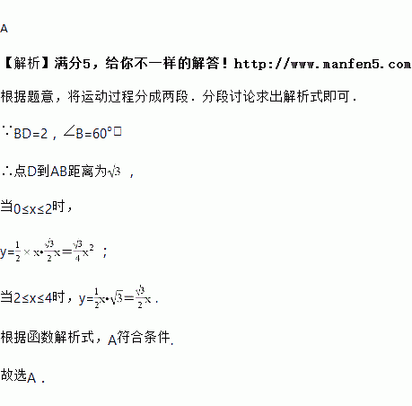 如图,等边△ABC的边长为4,点D,E分别是BC,AC的中点,动点M从点A向点B匀速运动,同时动点N沿B﹣D﹣E匀速运动,点M,N同时出发且运动速度相同,点M到点B时两点同时停止运动,设点M走过的路程为x,△AMN的面积为y,能大致刻画y与x的函数关系的图象是( )