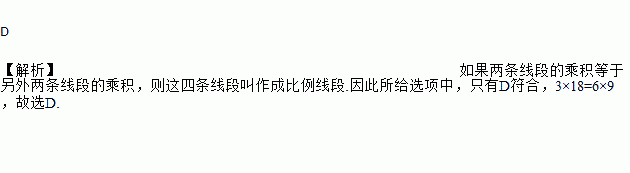 D 【解析】如果两条线段的乘积等于另外两条线段的乘积,则这四条线段叫作成比例线段.因此所给选项中,只有D符合,3×18=6×9,故选D.