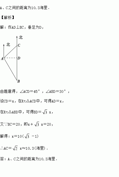 如图,一艘巡逻艇航行至海面B处时,得知正北方向上距B处20海里的C处有一渔船发生故障,就立即指挥港口A处的救援艇前往C处营救.已知C处位于A处的北偏东45°的方向上,港口A位于B的北偏西30°的方向上.求A、C之间的距离.(结果精确到0.1海里,参考数据