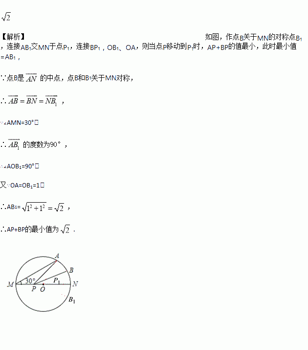 如图,MN是半径为1的⊙O的直径,点A在⊙O上,∠AMN=30°,B为AN弧的中点,P是直径MN上一动点,则PA+PB的最小值为_____.