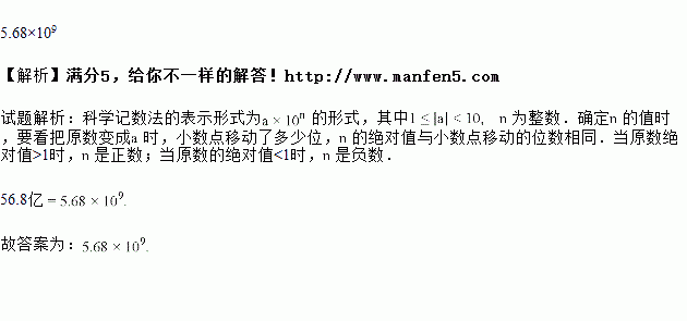 2017年7月27日上映的国产电影《战狼2》,风靡全国.剧中“犯我中华者,虽远必诛”鼓舞人心,彰显了祖国的强大实力与影响力,累计票房56.8亿元.将56.8亿元用科学记数法表示为_____元.