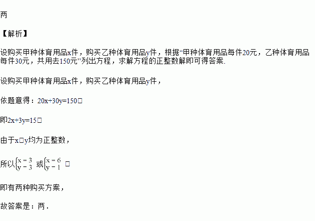 为了开展“阳光体育”活动,某班计划购买甲、乙两种体育用品每种体育用品都购买,其中甲种体育用品每件20元,乙种体育用品每件30元,共用去150元,请你设计一下,共有______种购买方案.