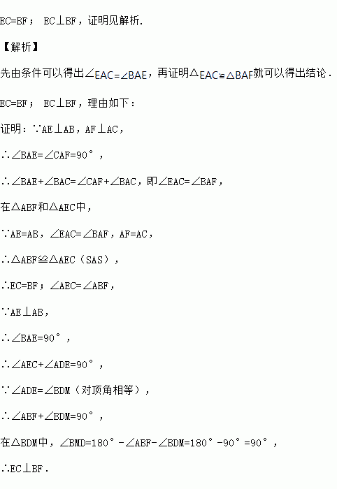 如图所示,已知AE⊥AB,AF⊥AC,AE=AB,AF=AC.试判断线段EC与BF的关系并证明.