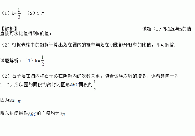 小明在操场上做游戏,他发现地上有一个不规则的封闭图形ABC.为了知道它的面积,他在封闭图形内划出了一个半径为1米的圆,在不远处向图形内掷石子,且记录如下:
