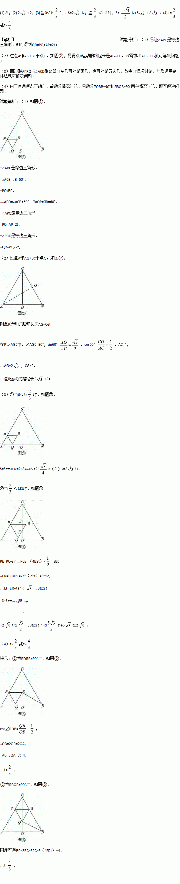 如图,△ABC是等边三角形,AB=4cm,CD⊥AB于点D,动点P从点A出发,沿AC以2cm/s的速度向终点C运动,当点P出发后,过点P作PQ∥BC交折线AD﹣DC于点Q,以PQ为边作等边三角形PQR,设四边形APRQ与△ACD重叠部分图形的面积为S(cm2),点P运动的时间为t(s).