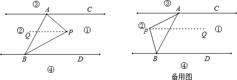 规定:线上各点不属于任何部分,点动点P若在某个部分时,连接PA、PB、构成∠PAC,∠APB、∠PBD三个角.(提示:有公共端点的两条重合的射线组成的角是0°角)