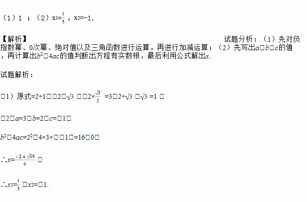 (1)1 ;(2)x1=,x2=-1. 【解析】试题分析:(1)先对负指数幂、0次幂、绝对值以及三角函数进行运算,再进行加减运算;(2)先写出a、b、c的值,再计算出b2-4ac的值判断出方程有实数根,最后利用公式解出x. 试题解析: (1)原式=2+1-(2-)-2× =3-2+-=1 ; (2)a=3,b=2,c=-1, b2-4ac=22-4×3×(-1)=16...