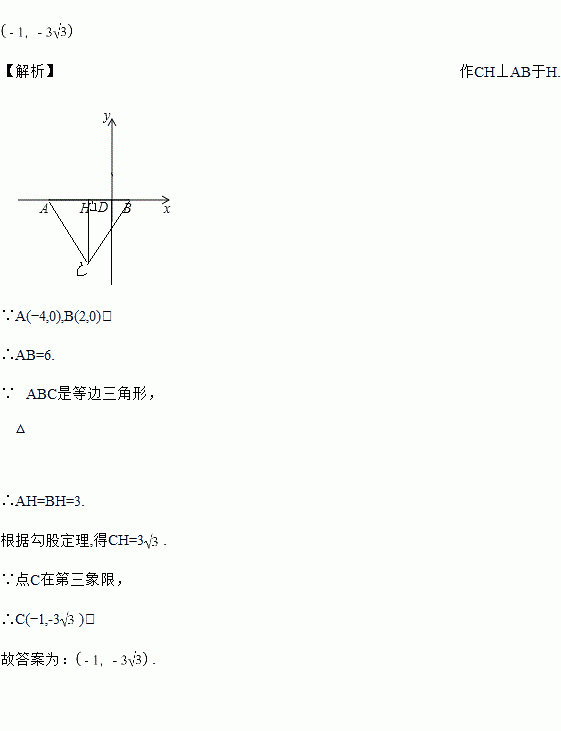 己知等边△ABC的两个顶点坐标为A(-4,0)、B(2,0),且点C 在第三象限,则点C的坐标为__.