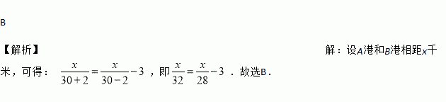 轮船沿江从A港顺流行驶到B港,比从B港返回A港少用3小时,若轮船静水速为30千米/小时,水速为2千米/时,求A港和B港相距多少千米.设A港和B港相距x千米,根据题意,得方程( )