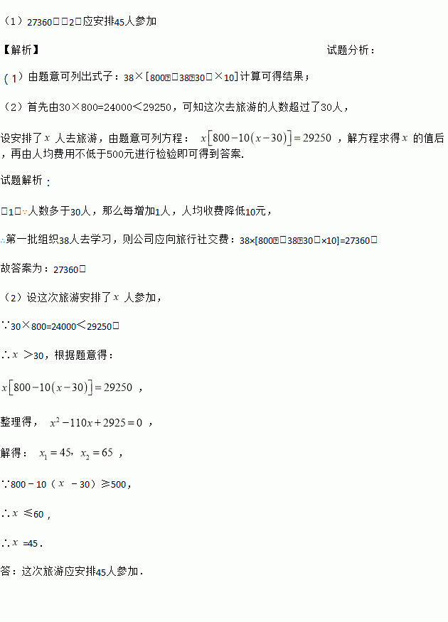 (2)如果公司计划用29250元组织第一批员工去学习,问这次旅游学习应安排多少人参加?