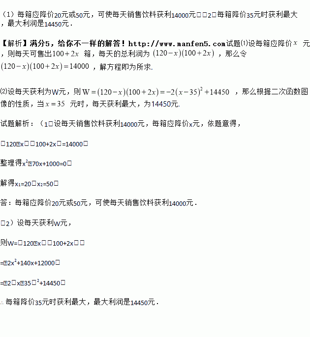 (1)如果要使每天销售饮料获利14000元,问每箱应降价多少元?