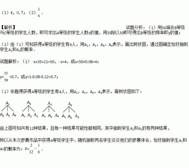 (2)将本次参赛作品获得A等级的学生依次用A1,A2,A3,…表示,现该校决定从本次参赛作品中获得A等级学生中,随机抽取两名学生谈谈他们的参赛体会,请用树状图或列表法求恰好抽到学生A1和A2的概率.