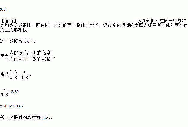 在同一时刻,身高1.6米的小强在阳光下的影长为0.8米,一棵大树的影长为4.8米,则树的高度为 _米.