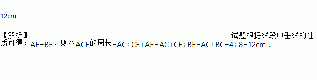 如图,在Rt△ABC中,∠C=90°,AB边的垂直平分线DE交BC于点E,垂足为D,AC=4cm,CB=8cm,△ACE的周长是_____.
