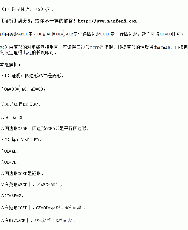 (2)若菱形ABCD的边长为2,∠ABC=60°.求AE的长.