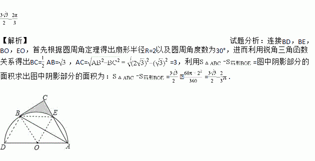 如图,以AD为直径的半圆O经过Rt△ABC的斜边AB的两个端点,交直角边AC于点E.B、E是半圆弧的三等分点,弧BE的长为,则图中阴影部分的面积为_____.