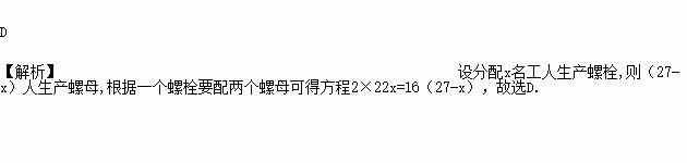 某车间有27名工人,生产某种由一个螺栓套两个螺母的产品,每人每天生产螺母16个或螺栓22个.若分配x名工人生产螺栓,其他工人生产螺母,恰好使每天生产的螺栓和螺母配套,则下面所列方程中正确的是