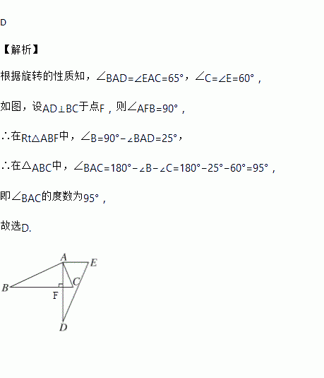 如图,将△ABC绕点A逆时针旋转一定的角度,得到△ADE,且AD⊥BC.若∠CAE=65°,∠E=60°,则∠BAC的大小为( )