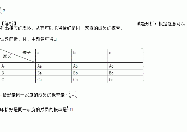 某幼儿园组织亲子游戏,主持人请三位家长分别带自己的孩子参加游戏,A、B、C分别表示三位家长,他们的孩子分别对应的是a、b、c.若主持人分别从三位家长和三位孩子中各选一人参加游戏,恰好是同一家庭的成员的概率是多少.(画出树状图或列表并算出结果)