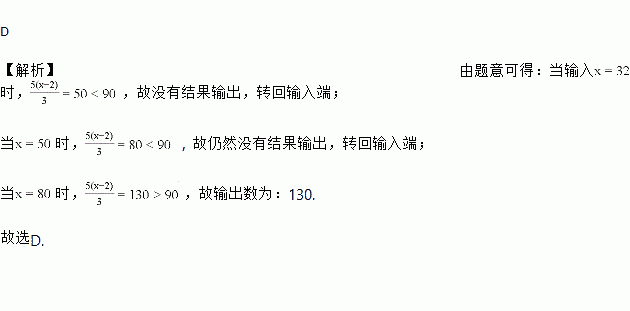 D 【解析】由题意可得:当输入时,,故没有结果输出,转回输入端; 当时,,故仍然没有结果输出,转回输入端; 当时,,故输出数为:130. 故选D.
