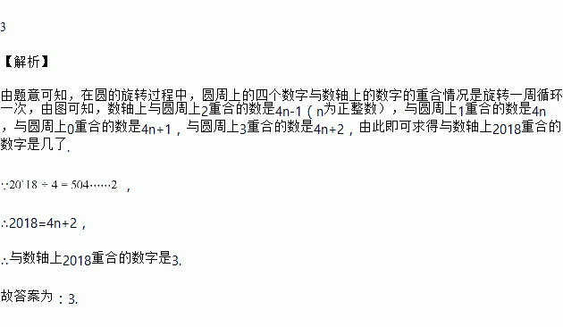 如图所示,数轴被折成90°,圆的周长为4个单位长度,在圆的4等分点处标上数字0,1,2,3,先让圆周上数字2所对应的点与数轴上的数3所对应的点重合,数轴固定,圆紧贴数轴沿着数轴的正方向滚动,那么数轴上的数2018将与圆周上的数字________重合.