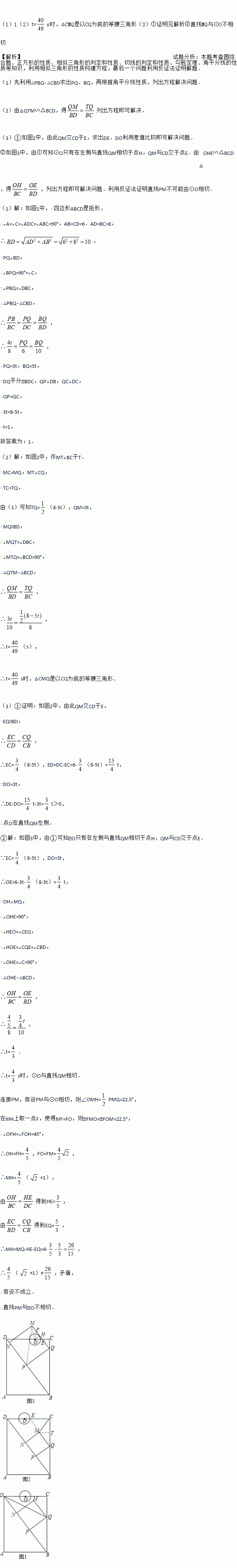 ②如图3,在运动过程中,当QM与圆O相切时,求t的值;并判断此时PM与圆O是否也相切?说明理由.