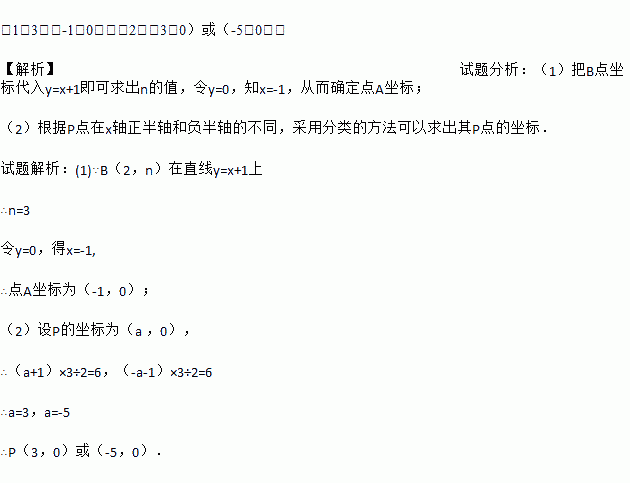 (1)3,(-1,0);(2)(3,0)或(-5,0). 【解析】试题分析:(1)把B点坐标代入y=x+1即可求出n的值,令y=0,知x=-1,从而确定点A坐标; (2)根据P点在x轴正半轴和负半轴的不同,采用分类的方法可以求出其P点的坐标. 试题解析:(1)∵B(2,n)在直线y=x+1上 ∴n=3 令y=0,得x=-1, ∴点A坐标为(-1,0); (...