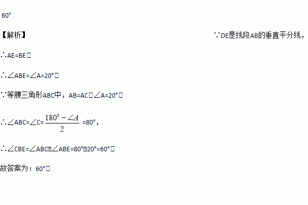 如图,等腰三角形ABC中AB=AC,∠A=20°,线段AB的垂直平分线交AB于点D,交AC于点E,连接BE,则∠CBE=__.