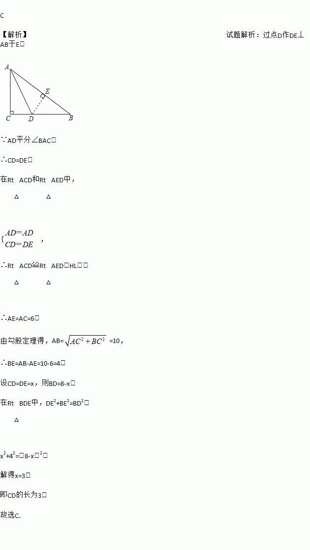 C 【解析】试题解析:过点D作DE⊥AB于E, ∵AD平分∠BAC, ∴CD=DE, 在Rt△ACD和Rt△AED中, , ∴Rt△ACD≌Rt△AED(HL), ∴AE=AC=6, 由勾股定理得,AB==10, ∴BE=AB-AE=10-6=4, 设CD=DE=x,则BD=8-x, 在Rt△BDE中,DE2+BE2=BD2, ...